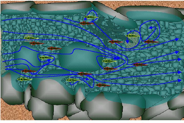 areas under waterfalls, pools, and behind logs or rocks. There are